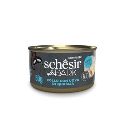 🇪🇸 Schesir After Dark Sabor Pollo y Huevos de codorniz en paté alimento húmedo Completo para Gatos latas 12 de 80 g