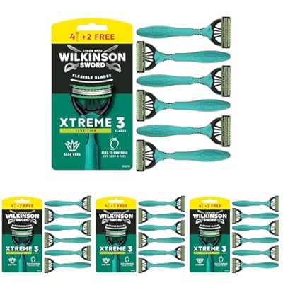 🇪🇸 Wilkinson Sword Xtreme 3 Sensitive - Maquinillas de Afeitar Desechables con 3 Hojas Flexibles y Banda Lubricante de Aloe Vera y Vitamina E Pack Promocional 4 + 2 Unidades Paquete de 4